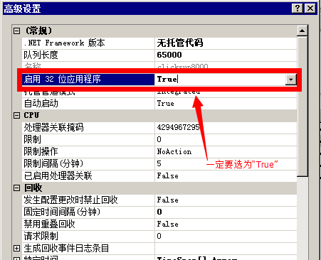 1、检查服务器上IIS中点晴MIS系统所用的应用程序池是否已开启32位应用程序支持,如果没有开启的话,则必须开启: