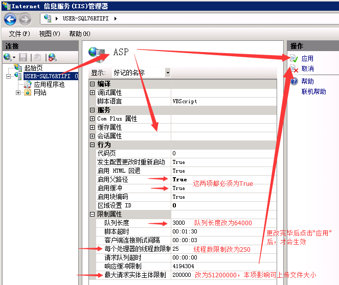 打开IIS管理器–双击“IIS”中的“ASP”– 打开“配置 ASP 应该程序的属性”–展开“限制属性”;修改“最大请求实体主体限制”的值,默认值为200000(即不到200KB),把它修改为你想修改的大小,如:51200000(50MB):