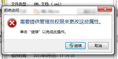 提示没有权利修改文件属性,用的是管理员登录的,还没有权限,哎,权限问题!同样,我们这时想编辑administrator权限、把修改和写入权限加上去,同样会弹出上面没有权限的提示!