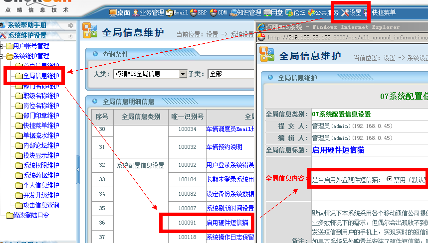 如果有高时效性需求,并且接收方不固定,也无法确定是否开通了手机邮箱,这时可以考虑启动硬件短信猫的方式,直接通过点晴OA系统发送手机短信至目标用户。采用这种方式的优点是短信实时到达用户手机、用户不需要做任何特别设置;采用这种方式的缺点是需要使用单位购置SIM卡,并且每发送一条短信移动通信公司都会收取0.1元/条的短信费。该费用和用户普通手机发送短信完全一致(使用单位也需要在SIM余额不足前及时前往各移动通信公司充值),只是点晴OA系统通过短信猫实现了系统自动发送通知短信至接收人,点晴公司对用户短信猫的使用过程中是不收取任何费用的。目前点晴OA系统支持的短信猫品牌暂为北京金笛公司硬件短信猫(特别提醒:目前点晴OA可能不支持最新版金笛短信猫,原因见下,请各用户自行甄别,我司不保证金笛短信猫能够在点晴OA下正常运行),各用户自行向该公司购买短信猫插入安装了点晴OA的服务器上、然后启动点晴OA的硬件短信猫功能,即可正常开启硬件短信猫支持了,其余品牌短信猫可能需要重新做接口才行。点晴OA系统硬件短信猫启用方法如下: