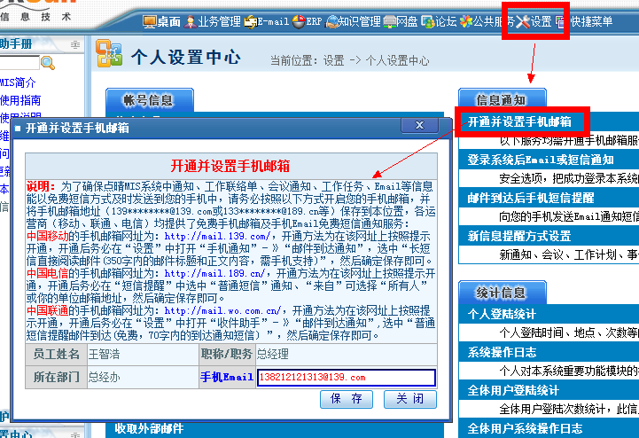 采用以上免费方式的手机短信提醒需要解决一个问题,就是系统用户必须先开通手机邮箱才行。现在三大移动通信运营商都提供了免费邮件到达短信通知,采用免费的那种就行了,不需要使用付费那种。