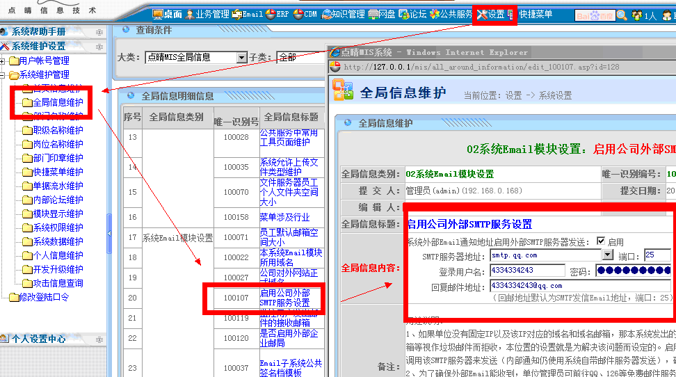 然后在全局变量中启用外发通知SMTP服务器设置(本项目务必设置,否则外发通知Email会被当成垃圾邮件拒收):