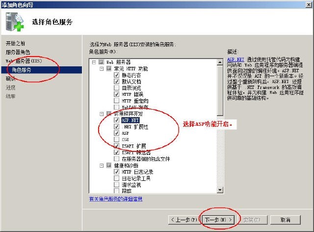 3、点击左侧角色服务,选择列表中的对应选项,比如要支持ASP,就要选择ASP功能: