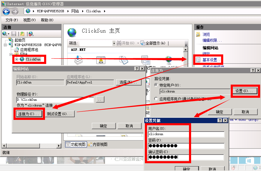 在Windows Server 2008 R2 64位系统上,即使按照以上方法设置后,仍然可能还是报以上错误:“Email子系统组件未正确安装,无法创建邮件对象,请联系管理员解决!错误码:573 ”,原因是 Windows Server 2008 R2 的安全性设置太高,导致普通IIS账号权限无法激活hmailserver组件,这时只能在IIS中对点晴网站clicksun的访问用户做变更,用一个有管理员权限的账号来作为访问账号。该账号可以用Windows Server 2008的管理员账号adminstrator,也可以另外单独新创建一个账号(建议新创建的账号名为:clicksun,方便识别管理),记得该账号一定要加入管理员组adminstrators