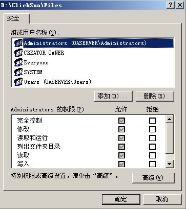 :点晴OA登录失败,安装最新版升级包提示升级成功但仍然不停的弹出更新提醒升级框、或者报错误:80004005/80040e14/an_error_occurred等,如何解决?![]() ![]() :出现这个问题有以下几个可能的原因:如果出现的是这个: ![]() 那么必须先按照这个教程的设置,将实际错误原因显示出来:点晴MIS出现“HTTP500内部服务器错误”提示,该如何处理? 将以上问题解决后,就会看到实际的出错原因了,然后按照以下相应情况对照解决即可: 原因一: 这个一般是使用点晴OA多年的老用户才会出现的报错,按照以下教程解决即可: 原因二: ![]() ![]() ![]() 这个错误的表现如上图,部分手工安装或自动安装的用户,目录 D:\clicksun\files 未成功开放everyone访问权限,这个目录正常情况下必须增加everyone的全部访问权限。检查一下目录D:\clicksun\files是否被赋予了everyone的全部访问权限,如果没有的话则增加一下,然后再登录系统试试。设置效果如下: