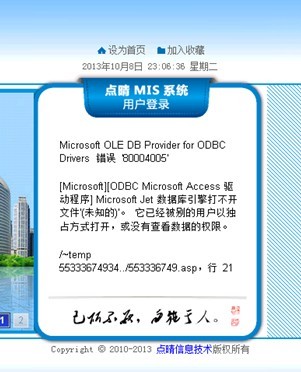 ![]() 这个错误的表现如上图,一般见于Windows Server2008操作系统下,原因是系统目录权限未放开,将目录 C:\Windows\temp 增加everyone访问权限即可。检查一下目录C:\Windows\temp 是否被赋予了everyone的全部访问权限,如果没有的话则增加一下,然后重启计算机,如果不重启,会出另外一个错误(Provider 错误 '80004005' 未指定的错误)!然后再登录系统试试。