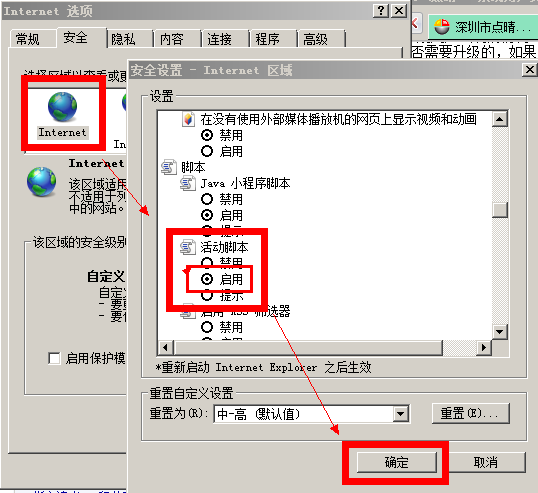 ![]() 提示“请稍候,升级中...”,然后就永远停止这个界面不动了。原因是服务器浏览器安全性设置为高,导致脚本支持被禁用,点晴OA升级及正常使用都必须启用javascript脚本支持,启用方法见本帖3楼回帖,启用后就可以正常升级了。