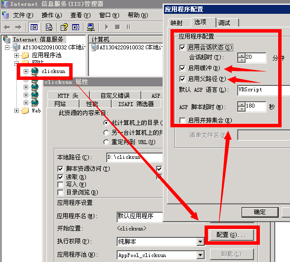 ![]() 这个错误其实是用户安装好程序后,没有检测MIS系统是否能正常运行后,就立即做了升级动作后看到的错误页面,出现这个错误的原因是IIS中没有启用缓冲支持造成的,开启IIS的缓冲支持即可。下面以Windows Server2003为例说明启用缓冲支持方法。进入安装了点晴MIS系统的服务器,前往:开始-》控制面板-》管理工具,找到:Internet 信息服务(IIS)管理器,然后找到网站clicksun,右键点击属性,出现如下界面: