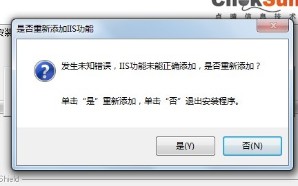 安装报错:发生未知错误,IIS功能未能正确添加,是否重新添加?