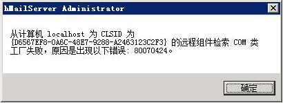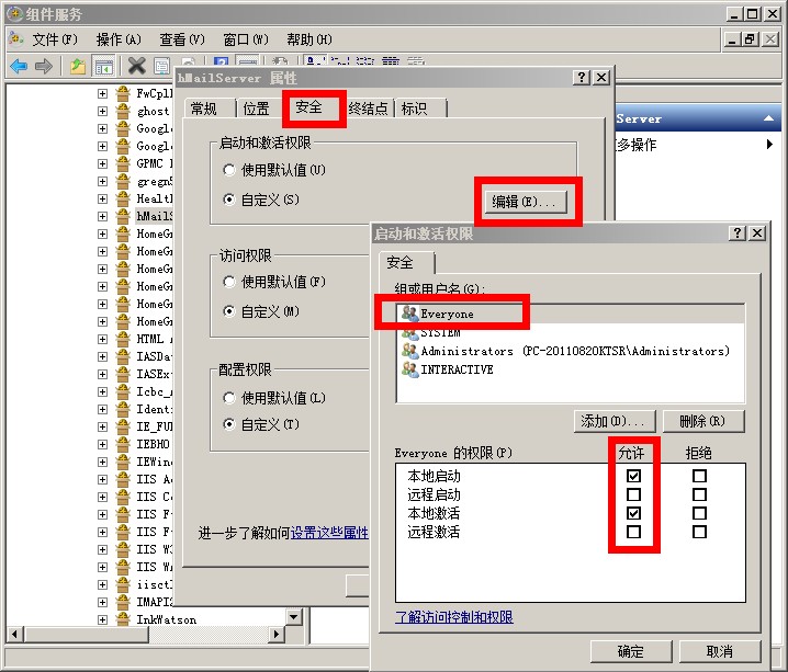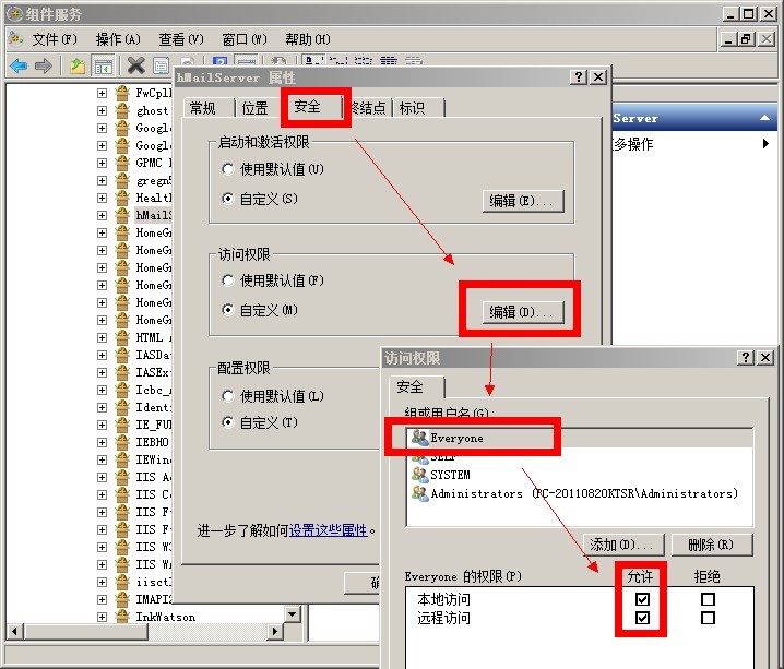 hMailServer的组件权限要也要设置成everyoneIIS来宾全部权限。服务器组件权限修改:Windows开始-->控制面板-->管理工具-->组件服务-->计算机-》我的电脑-》DCOM配置-》HMailserver组件,右键:“启动和激活”与“访问权限”项自定义增加everyoneIIS来宾权限。