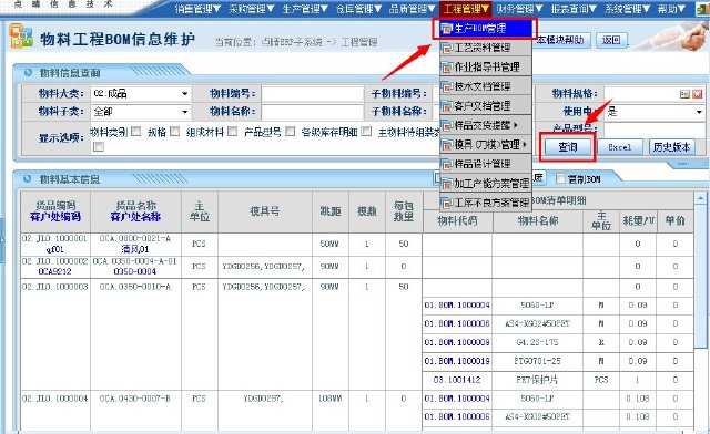 工程管理——生产BOM管理,需点击查询按钮,如图: