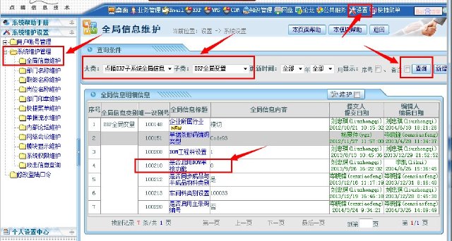 BOM创建的审核功能是否启用设置方法:设置——系统维护管理——全局信息维护——ERP子系统全局信息——ERP全局变量——查询,如下图示: