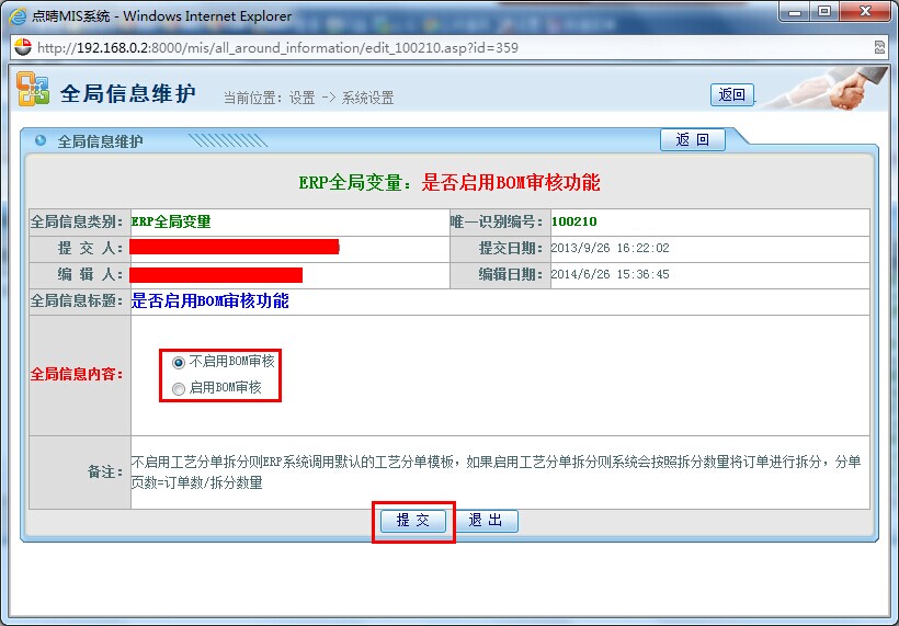 选择——是否启用BOM审核功能——进行编辑,提交即可,如下图: