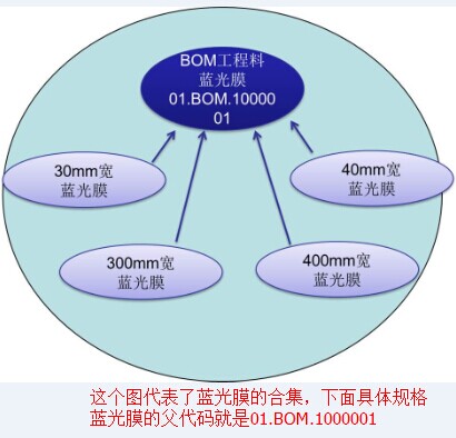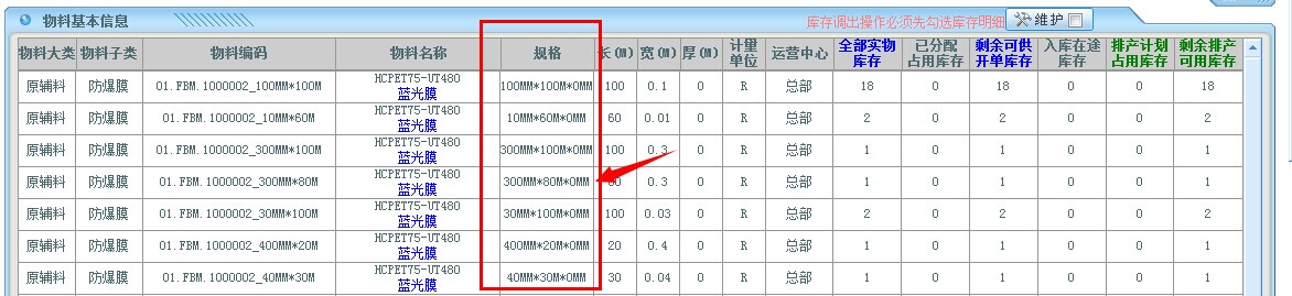 仓库里面有100MM宽、300mm宽、400mm宽的蓝光膜。生产一种成品需要用到30mm的蓝光膜,那么理论上面来说这些库存都是可用库存,系统是如何来判断哪些物料是可用的呢,就是通过具体规格物料的父代码和这个成品的物料清单上面的BOM工程料的编码是否一样,如果一样系统就会将库存调出供PMC排产时候选择。如果不一样系统就会认为他们是不可用的物料。