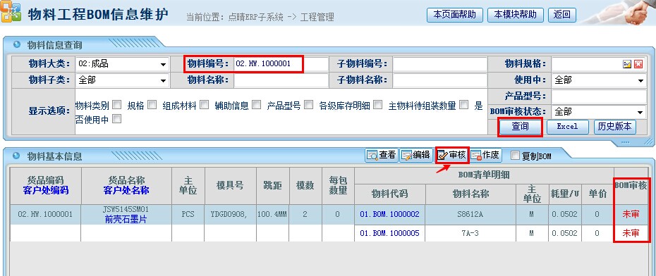 操作步骤:工程管理——生产BOM管理;进入页面后如下图操作: