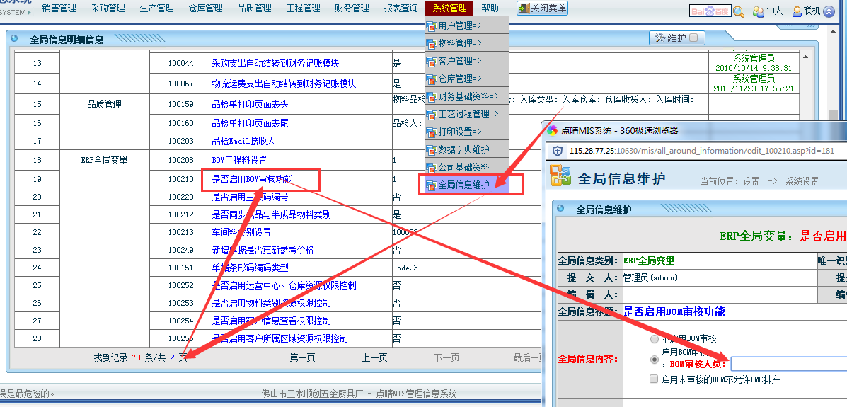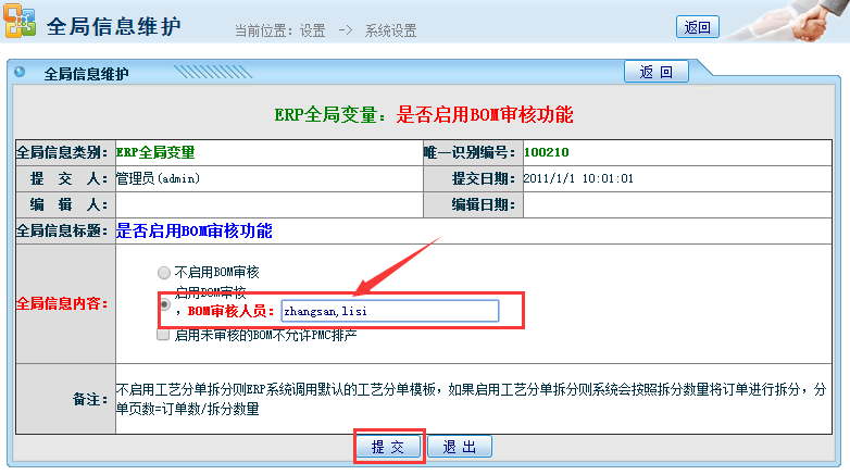 系统管理——全局信息维护——翻到第二页——ERP全局变量——选择是否启用BOM审核功能。如下图所示: