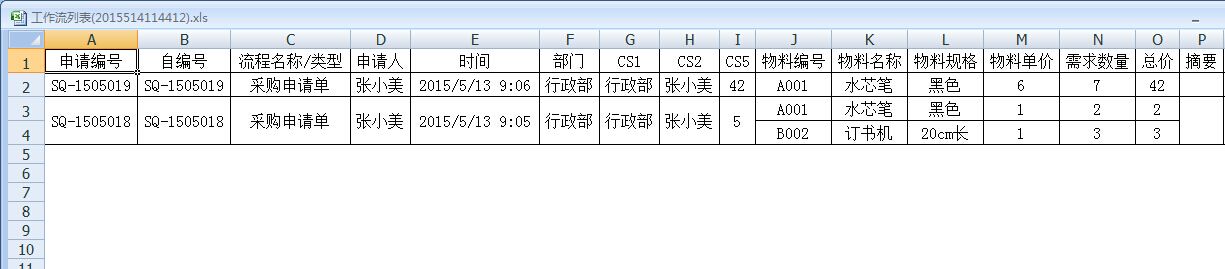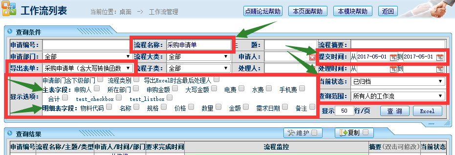 1、可按照要求导出不同条件的单据,如时间段(五月的前俩星期)、名称(采购申请单)、状态(归档)