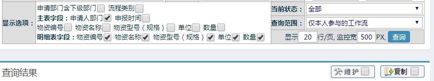 3、表单内容的显示选项自定义勾选主表字段明细表字段(勾选了CS1、CS2、CS5、物料编号等)