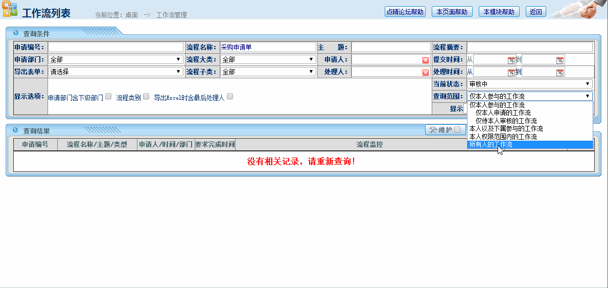 登陆点晴OA——工作流管理——已办工作流进入页面: