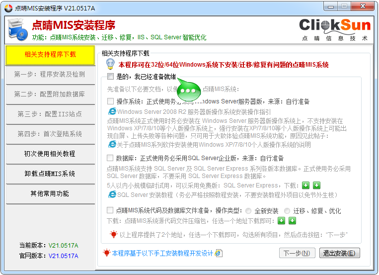 下载点晴MIS系统安装程序(任选一个地址下载即可):,程序安装参考教程:http://13328.oa22.cn