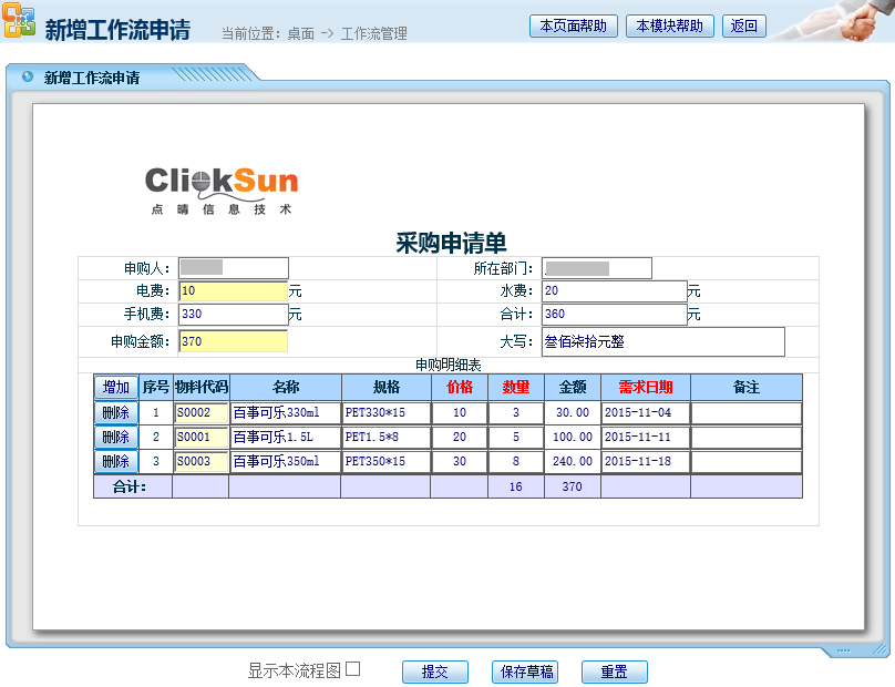 :问下,要做一个采购申请的模板,有没有如果明细部分行数不够可以由申请人自己添加的功能?并且希望实现部分控件禁止录入、禁止为空、显示合计、自动转换大写金额、设置预置数据以便选择等效果。![]() 可以,利用点晴OA系统工作流表单模板中的行输入宏控件,可以方便的实现采购单等需要填报多行信息的需求。 效果展示视频: 附件:工作流行输入宏控件效果展示.wmv ![]() 进入工作流模块,新增模板或编辑模板: 勾选“启用行输入宏控件”,就会在模板编辑器中看到增加了一个“$input_rows$”,这个就是行输入宏控件,将它挪到需要填写的适当位置。 然后维护这个行输入宏控件中各个列字段,通过适当的使用数据源功能,可以实现多个字段的自动填充、禁止录入等,无需用户手工填写: ![]() 在上面“数据来源”列,可以绑定预置数据,绑定数据源方法参考下面教程,可以实现用户点击时,自动弹出页面选择预置的内容,也可以设置“禁止录入”实现允许或禁止用户更改内容: 下面是用户申请采购单时的效果: ![]() 更多详细操作帮助参见: