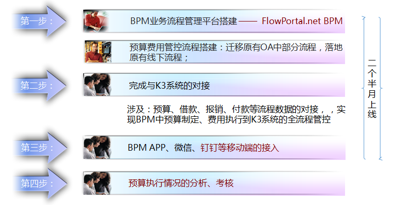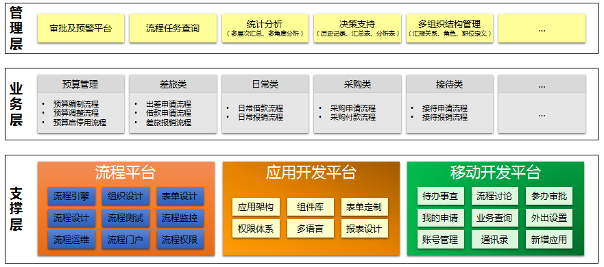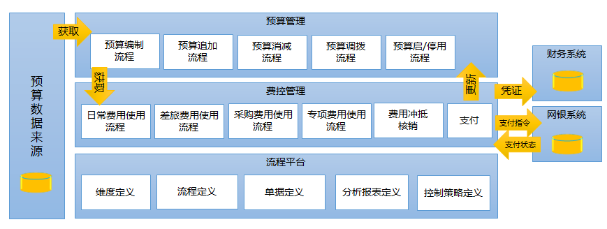 案例二BPM平台架构,以费用控制为核心,以实现预算管理为目标,通过灵活的多维数据模型、完整的预算体系、完善的流程管理、及时的费用控制和强大的数据整合能力,帮助企业搭建全面费用预算管理体系。