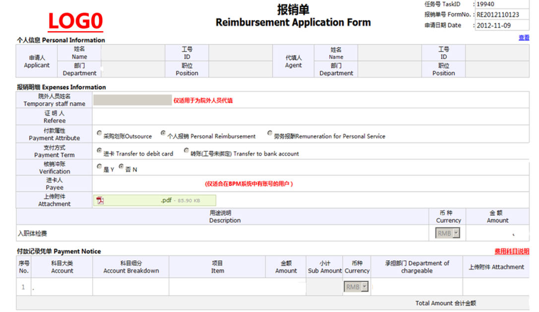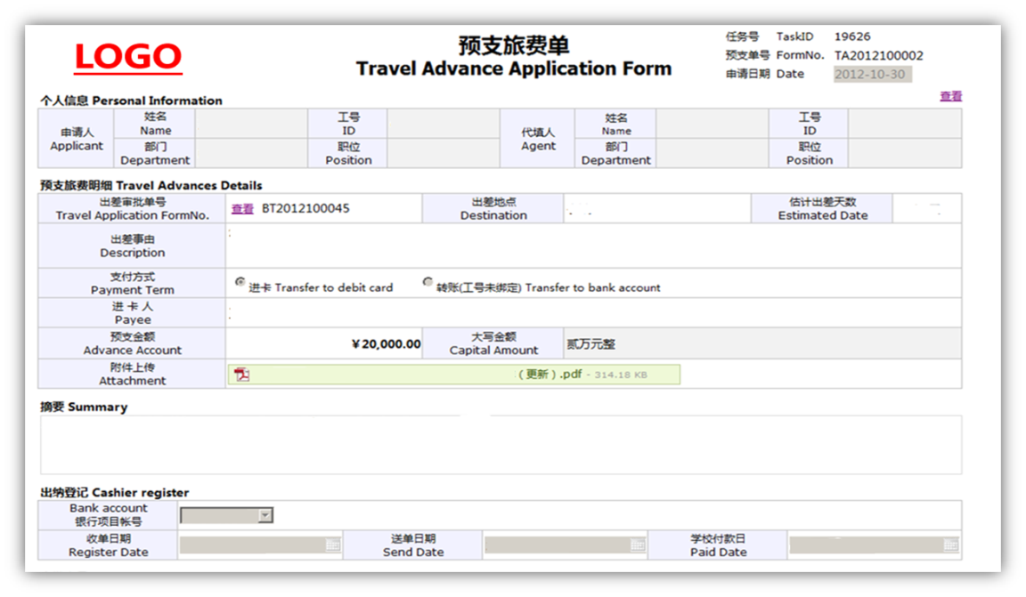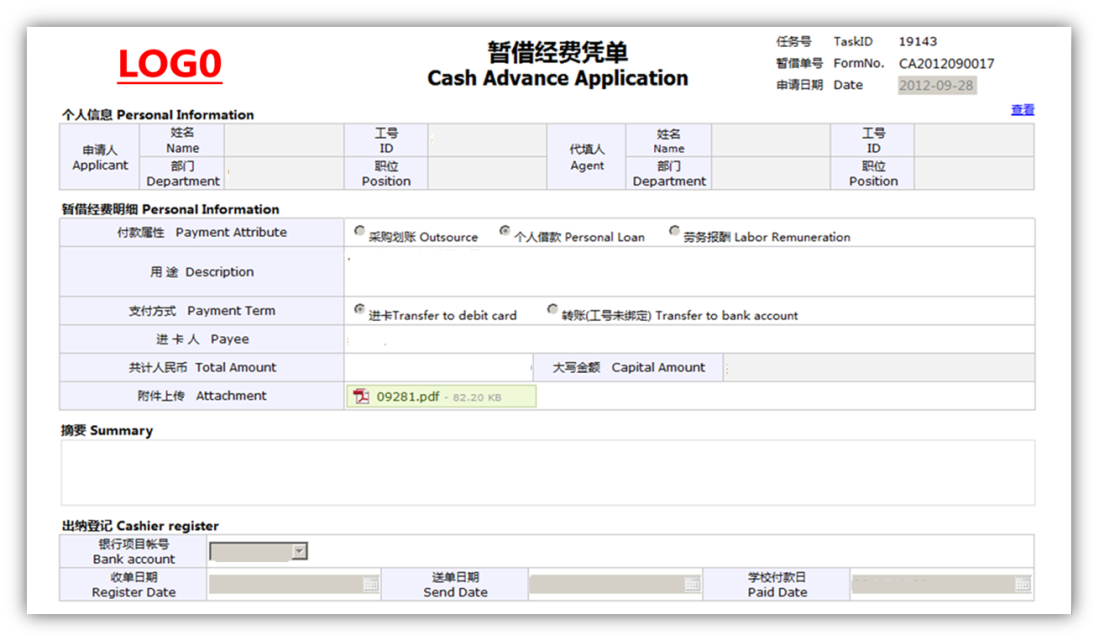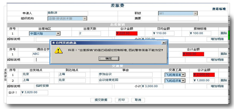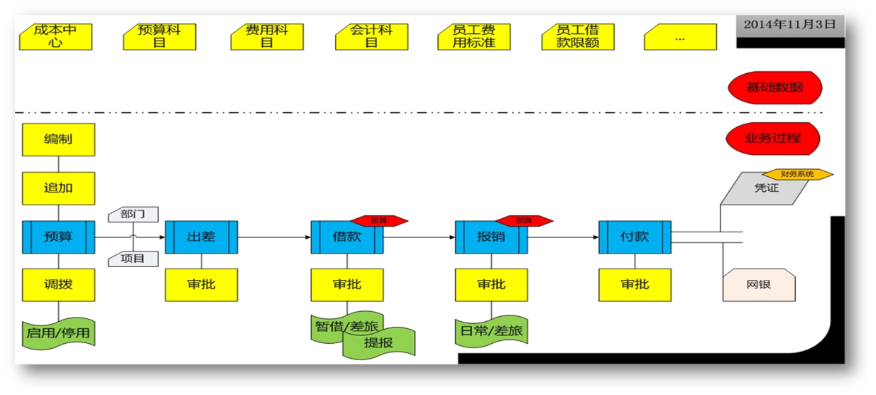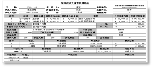 报销单据电子化:主要包括三大类信息:部门、人员等基础信息;预算项目、费用科目及金额等预算信息;用于审批、分析等所需的关键业务信息。单据由纸质单据变为电子单据,自动生成单据编号和条码;实现基础信息自动带出(申请人、所属网络、办事处、大区、申请日期、收款人银行、收款人账号等);合计金额自动计算、大写金额自动生成;字段可以设置自主填写或下拉选择,可以定义各个字段的数据格式;字段可以设置是否必填,并做必填的提醒和校验;可以对未完成核销的借款自动进行提醒;单据允许上传附件,并可以定义允许上传附件的大小。