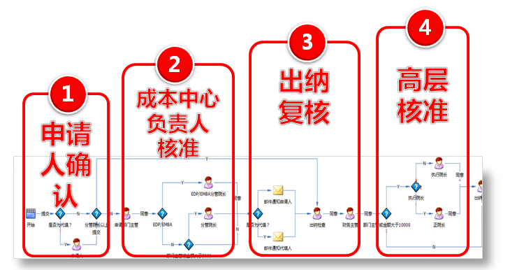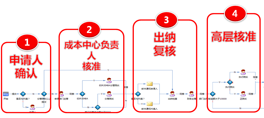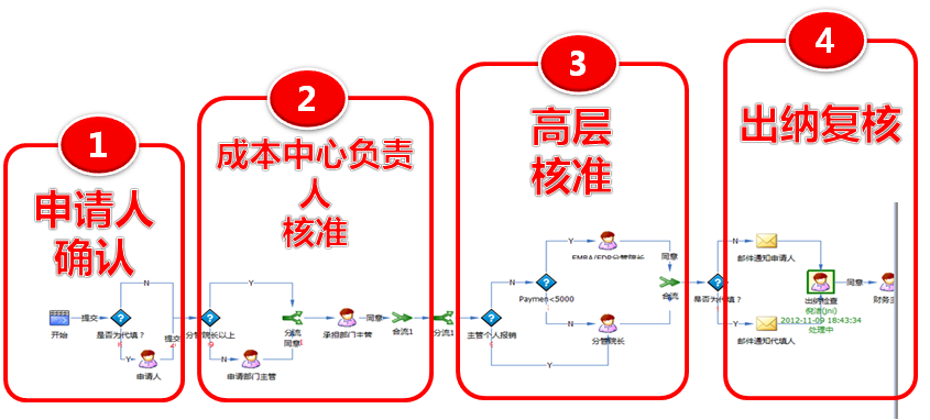 费用报销网络化:系统通过IE浏览器访问,能上网就能填单及审批,审批任务实时发送给审批人,保证审批人及时收到审批任务,系统发送任务邮件或短信,提醒审批人尽快审批,审批人通过回复邮件或者短信,即可完成审批。