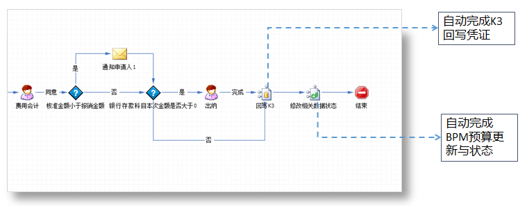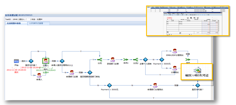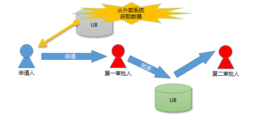 U8整合方案:在流程流转中可以自动更新、获取外部系统数据,可以携带数据在各系统间流转。通过调用U8提供的WebService(二次开发接口)、获取项目名称、会计科目等信息,同时回写报销单中会计科目、金额等信息到U8财务系统,使其自动生成财务凭证并返回凭证号到报销单上。