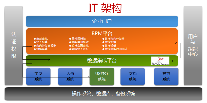 案例二背景:上海市人民政府为实现将上海建设成为国际金融中心的国家战略、满足上海乃至全国金融业发展并与国际接轨的迫切需要,依托上海交通大学而创建的一所按照国际一流商学院模式办学的金融学院;学院培养金融MBA(工商管理硕士)、金融EMBA(高级管理人员工商管理硕士)、全球金融DBA(工商管理博士)、金融硕士、金融学博士、EDP(高层管理教育)等高人才;实施包括:费用控制、人事、行政在内的16支流程;项目重点:预算控制、流程之间数据关联性、与BizTalk的整合、与U8整合、与Portal集成。