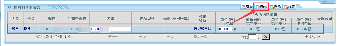 进入页面后筛选找出对应的模具编号资料;点击“编辑”按钮:
