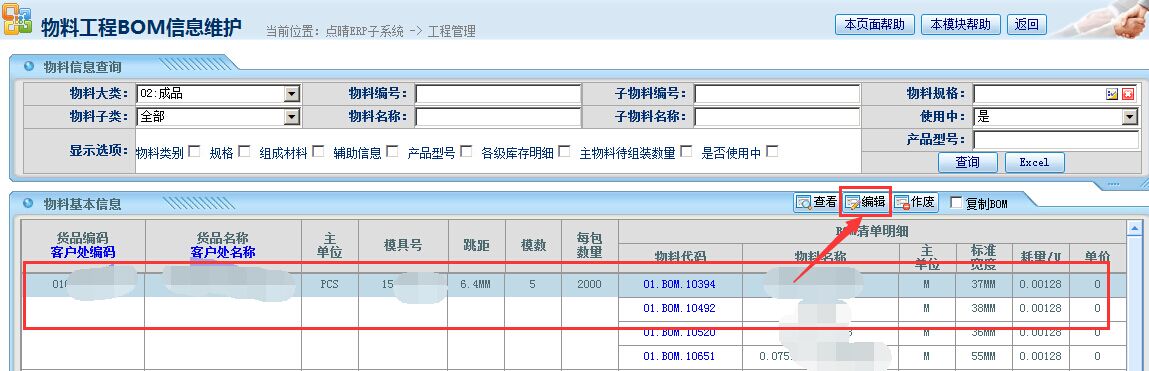 选中BOM明细进行编辑: