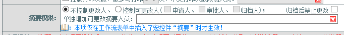 为了激活这个功能,网管在设计工作流模板时,必须先在模板中放入一个摘要字段,才可以在后续审核、归档等环节对这个特殊字段进行编辑更改等复杂权限的控制和维护。注意,一个模板只允许插入一个摘要字段,不支持多个摘要字段宏控件: