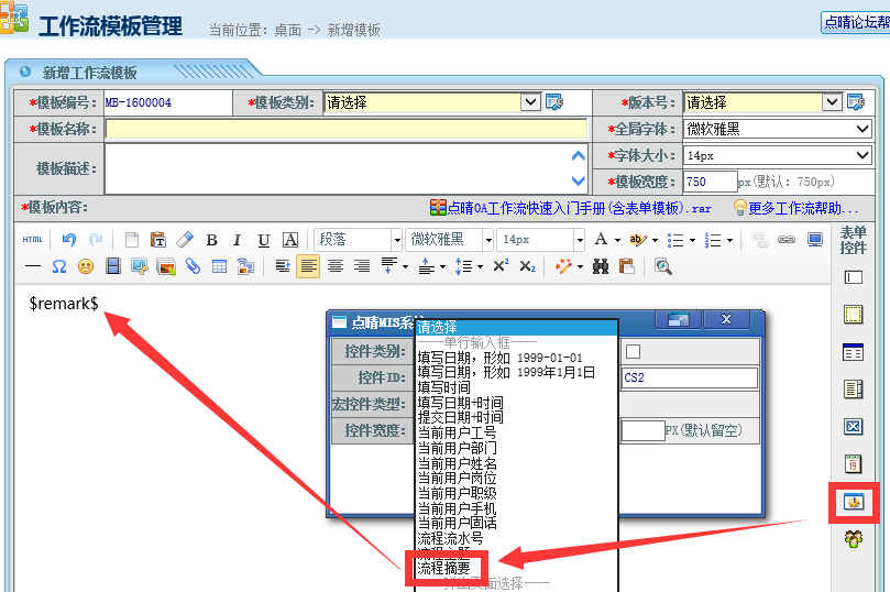 1、流程设计页面提示:本项仅在工作流表单中插入了宏控件“摘要”时才生效,如何使用啊?