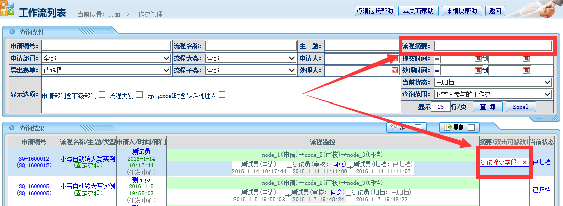 维护后的摘要信息可以作为查询条件查找,有权限的用户也可以直接双击摘要进行更改: