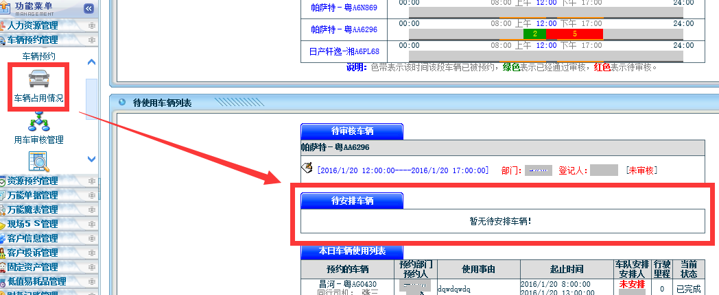 ![]() 也可以在工作流中,点击工作流申请,找到车辆预约管理: ![]() 申请完毕后,该申请就会按照设定的工作流进行审批了。 审批完毕后,就会进入到第二个环节:车辆调度安排。 、车辆调度安排 先要确保已经按照上述设置在权限管理中开放车辆安排权限给车队调度员了,必须有安排车辆权限才会看到下面的“待安排车辆”栏目: ![]() 找到需要调度安排的车辆,安排完毕后,系统会自动后台发送EMail通知该用车的申请人。 用车完毕后,车队应该将用车信息(开始和结束里程、路油费等)录入系统中。 用车信息维护![]() 找到本次用车申请单,录入用车相关信息(开始和结束里程、路油费等): ![]() 注意事项: 1、如上图箭头位置所示:同一辆车前一次的里程结尾记录与后一次里程开始记录需一致。 2、若一次用车里程差别较大,则需找用车人的责任(比如根据填写的目的地判断,本来10公里的路程,里程显示走了80公里)。 车辆管理以上功能可以有效解决如下问题: 1、避免公车私用的现象出现; 2、避免车辆管理资金无法追查的现象。 3、车辆资源能有效的分配。 用车信息查询![]() 车辆费用分析![]() 该文章在 2016/8/31 14:43:52 编辑过