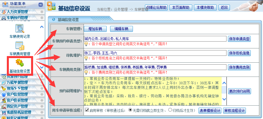 ![]() 在使用本模块之前,需要先进行系统基础参数设置:车辆、司机、申请类型、审批流程等: