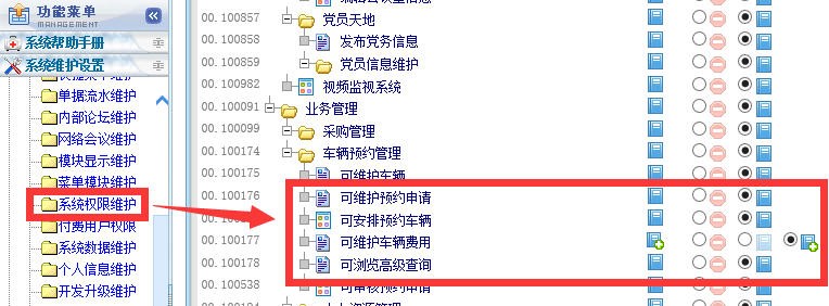 需要注意的事项:上面的车辆审核流程归档人必须是车队车辆安排的调度员,这样才能实现车辆审批完毕后,系统自动通知这个归档人(也即车队车辆调度员),然后归档人(车队调度员)才方便进行车辆司机等安排工作。车辆调度员应该开放如下红色框内权限,才能完成相关工作: ![]() 详细基础信息设置方法、以及审批流程和路线参见以下教程: 完成以上基础参数设置后,就可以使用本模块了。 、车辆预约申请可以在业务管理-》车辆预约管理中,点击车辆预约: