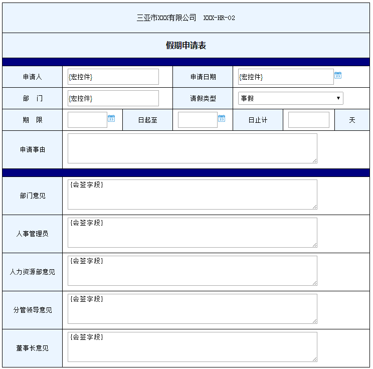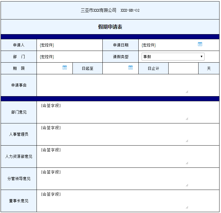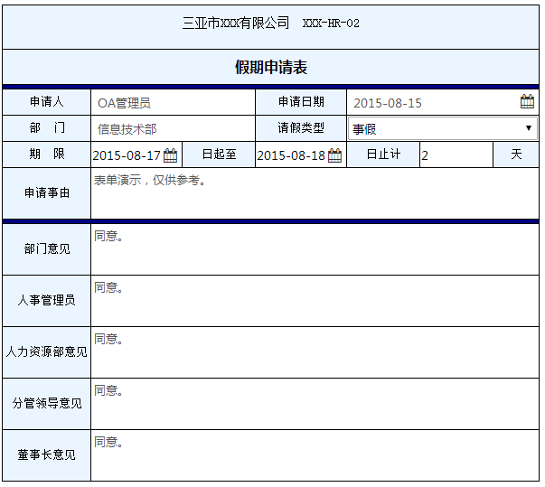 最终设计的表单效果截图。大家可以看出,每个控件和所在的表格都是严丝合缝的对齐(参看请假类型控件的边框,其他控件无边框看不出来,并且取消)了控件边框,让控件完全融入了表单中了。其中,日期控件的宽度和关联的单行文本框的宽度之和,正好等于所在表格的宽度,而且能够完全呈现日期内容。