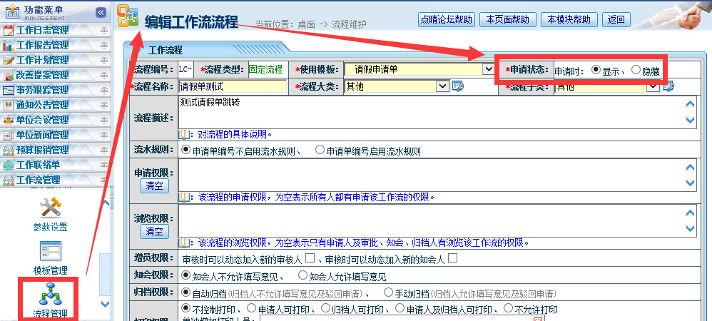 以网管身份登录,进入流程管理中,找到这个流程,编辑,将申请状态改为申请时显示即可: