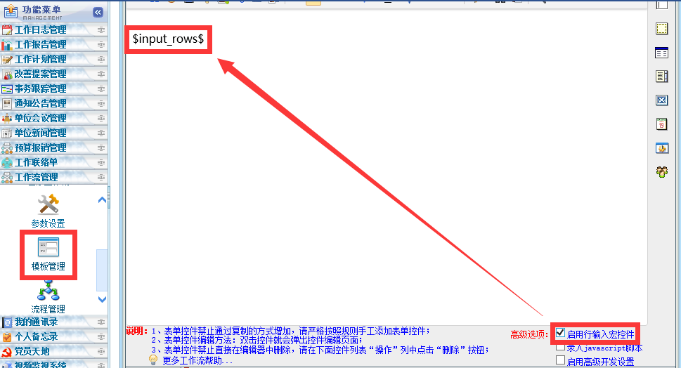 :点晴OA工作流表单设计中自动增加下一行是用什么控件?是行输入宏控件吗?要如何设置?![]() ![]() 效果展示视频: 附件:工作流行输入宏控件效果展示.wmv ![]() 用行输入宏控件,可以实现无数行的插入保存。每个表单模板支持一个行输入宏控件: ![]() 行输入宏控件的代码为:$inut_rows$,网管在设计表单模板时,可以将这个代码通过剪切-》粘贴的方式,移动到合适的位置上。注意移动的时候切勿拆分这个代码,否则会导致无法正常使用。 ![]() 行输入宏控件总共支持20个字段,网管可以根据实际需求,确定各个字段之间的关联,通过实现设置自定义数据库源,可以方便的实现自动填充其他字段的效果,在进行采购单、请假剩余天数之类的多数据关联调用时,会非常方便用户填写数据。行输入宏控件也可以方便的实现字段数据自动汇总合计等效果。 详情参见实例教程: