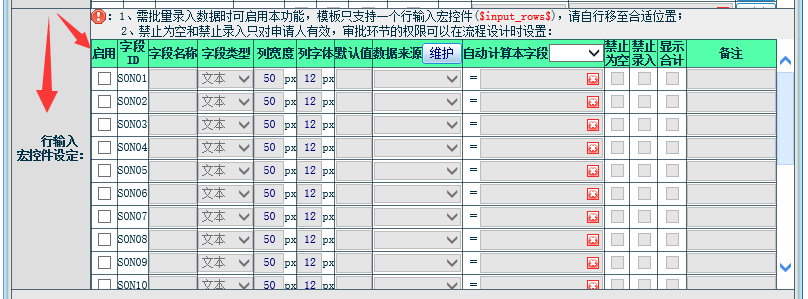 点晴永久免费OA工作流表单设计中自动增加下一行是用什么控件?是行输入宏控件吗?要如何设置?
