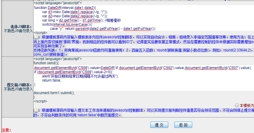 :请问工作流表单模板中的两个不同日期控件之间可以进行相减运算获取需要的间隔时间吗?如何操作?![]() 由于点晴OA工作流表单模板支持完整的Javascript脚本,所以表单模板中的两个不同日期控件之间在理论上的确可以利用控件的onchange事件触发Javascript脚本自动计算出相隔的时间,可以精确到天、小时、分钟等。