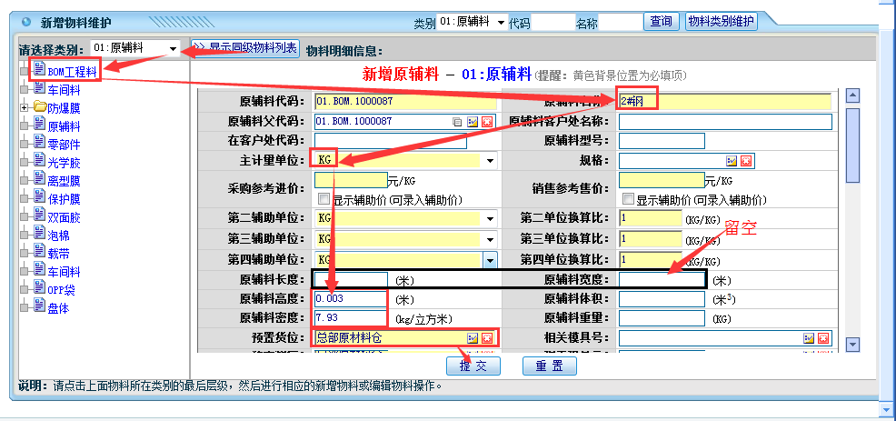 步骤:选择“原材料”——点击“BOM工程料”——填入原材料名称——选择主单位——录入原材料高度(厚度)——录入原材料密度——选择预置货位——点击“提交”完成。