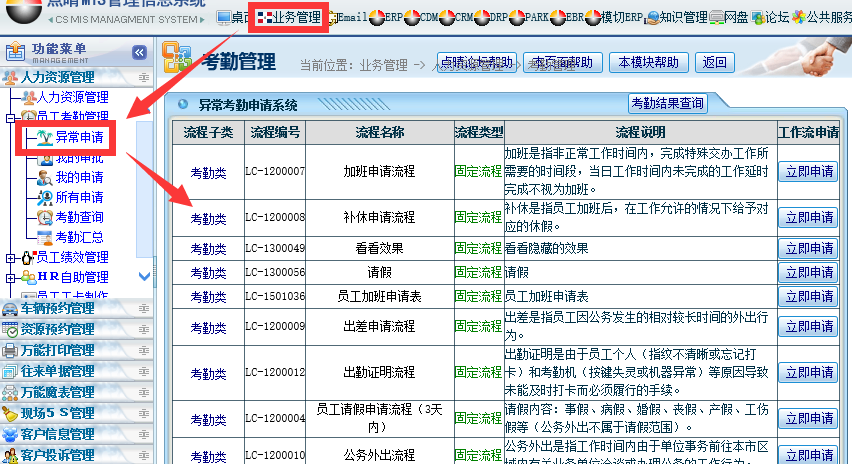 工作流中设计的考勤申请流程在业务管理看不到,要如何设置才能看到?