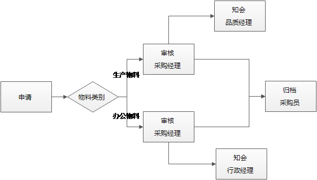 :工作流流程设计时如何实现知会的条件跳转判断?![]() 点晴OA工作流流程设计时不直接支持条件跳转到知会节点,条件跳转只支持审核节点,所以要实现知会节点的条件跳转,必须先通过审核节点来跳转,管理员在设计审核节点时,就必须考虑到如何实现之后的知会动作。 例如: 如果申请人申请采购某种物料,生产性物料要知会品质部经理,办公用物料要知会行政经理,但都是由采购经理审核,那么应该在申请环节增加一个采购物料类别的字段,并将审核节点拆分为两个审核节点,审核人都是采购部经理,这样申请生产性物料时,采购经理审核完毕后,就会知会品质部经理;申请办公用物料时,就会知会行政经理了。 ![]() 该文章在 2017/11/16 14:34:12 编辑过