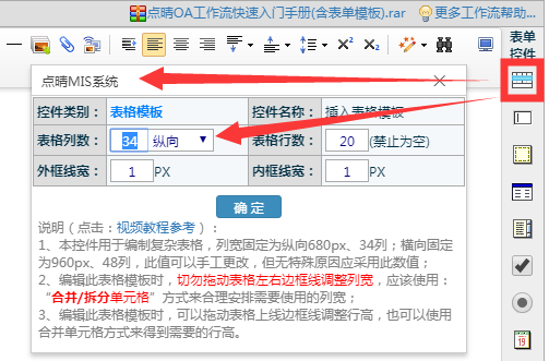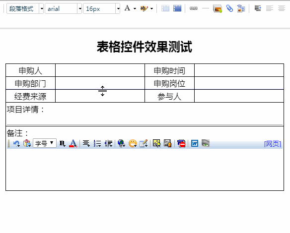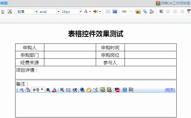 注意,在新版点晴OA工作流表单设计器中,表格的插入是通过表格控件,然后合并各个单元格最终实现需要的复杂表格样式: