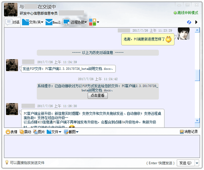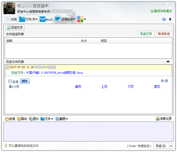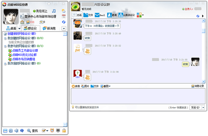 即时消息收发,支持自定义表情及字体设置,图片文件收发,远程协助等功能。