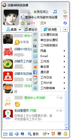 点晴MIS信息通PC客户端是运行在Windows版本PC机上的独立程序,可以快捷方便完成以下工作: