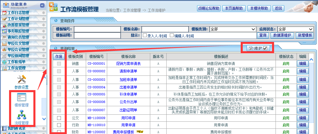 点晴OA系统工作流模块管理员设计时如何作废或隐藏不再使用的表单模板或流程? 点晴OA系统中已经创建的工作流表单和流程,只允许作废,不允许彻底删除,否则可能会导致系统已经申请的工作流出现逻辑错误。由于点晴OA采用的是SQLServer大型数据库,对于SQLServer大数据库而言,工作流模板表单和流程占用的这点数据量完...